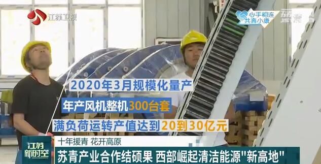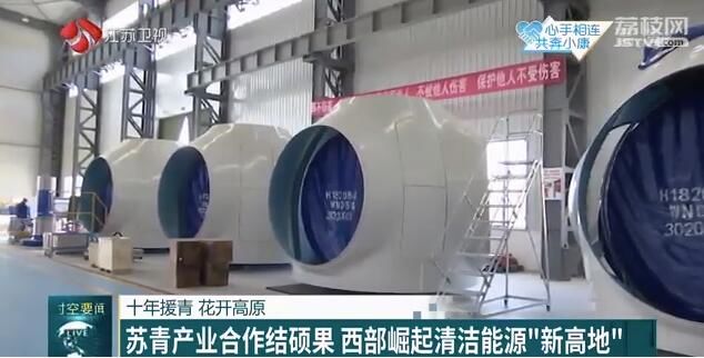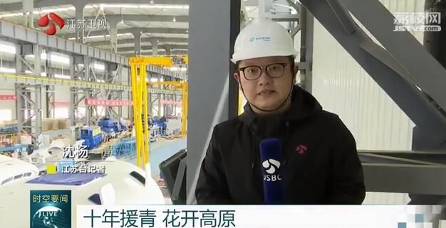 江苏台记者 沈杨:“我现在是在青海海南州的远景能源,这是江苏援青的新能源装备项目,也是海南州历史上最大的新能源装备项目, 大家顺着镜头往下看,这些风机已经装配完毕,即将发往青海共和县的切吉乡。”