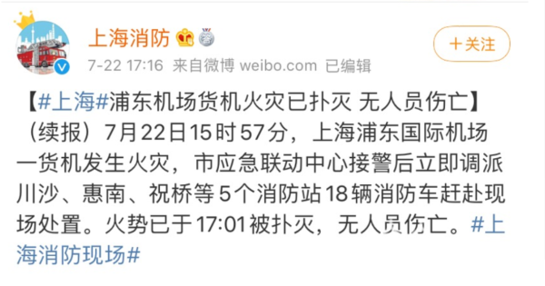 7月22日15时57分,上海浦东国际机场一货机发生火灾,应急联动中心接警后立即调派川沙、惠南、祝桥等5个消防站18辆消防车赶赴现场处置。