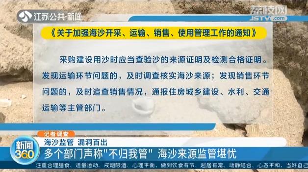 这些海沙从哪里来的,有没有经过严格的检测,什么人在销售,又卖给什么人、用于什么?对于这一系列问题,当地监管部门均无法回答。而这无法回答的背后,是监管的漏洞和缺失:交通部门只查检测报告,不查来源,就很难保证是否属于正规沙子;检测报告不全,有的有、有的没有,也就很难保证这些海沙在国家允许的质量范围;而市场监管部门对销售地放任不管,住建部门不细查海沙的具体使用,就会导致海沙会被滥用,一旦超范围用于建筑上,就会给建筑安全造成重大隐患!