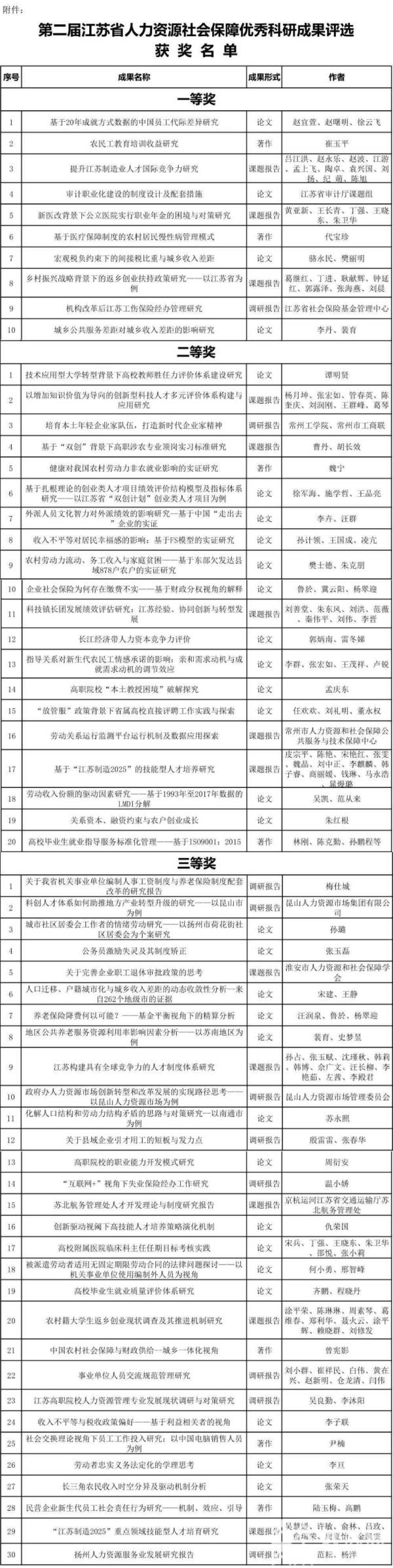 日前,江苏省人社厅发布了《关于第二届江苏省人力资源社会保障优秀科研成果评选获奖情况的通报》,经资格审查、专家评审、文字查重比对情况抽查等程序,60项成果获奖,其中一等奖10项、二等奖20项、三等奖30项。