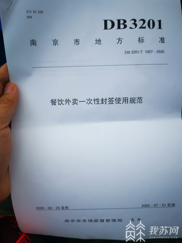 为保驾护航外卖食品安全的“最后一公里”,经南京市市场监管局、江苏省餐饮行业协会、阿里本地生活服务公司、南京市标准化研究院等多个单位的共同努力,制定颁布了“餐饮外卖一次性封签使用规范”南京市地方标准。