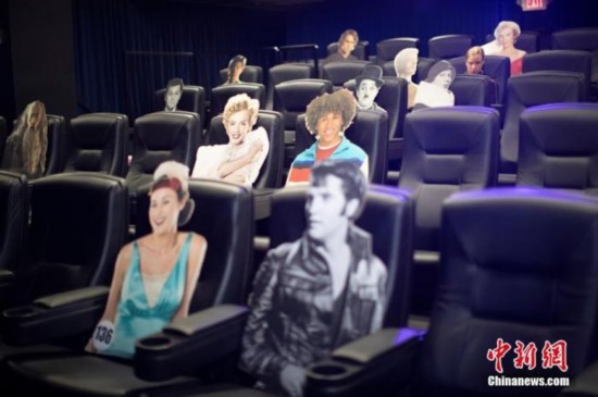 当地时间6月17日,美国加州洛杉矶,为了在新冠肺炎疫情期间重新开放,电影院用电影角色纸板隔开座位,以保持观众之间的社交距离。 图片来源:视觉中国