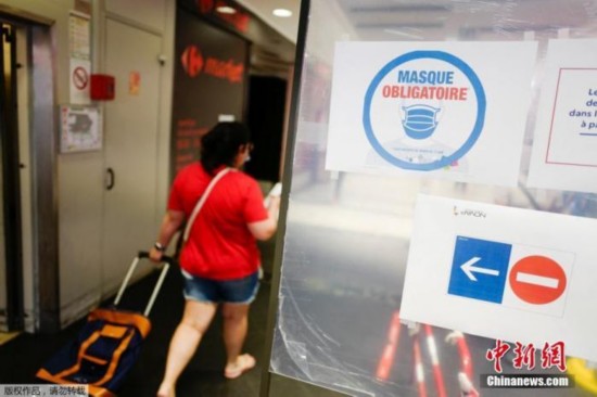 当地时间7月20日,由于法国一些地区新冠疫情出现反弹,法国开始执行强制要求民众在封闭公共场所佩戴口罩的法令。图为在巴黎的一家商店里,顾客戴着口罩进入。