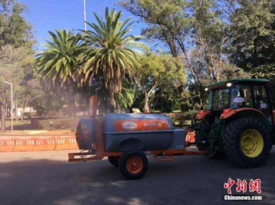 当地时间7月13日,在巴西圣保罗,一辆消毒车在当地一公园喷洒药水进行消毒作业。当日,巴西最大城市圣保罗市允许符合卫生和防疫条件的公园在工作日恢复开放。 中新社记者 莫成雄 摄