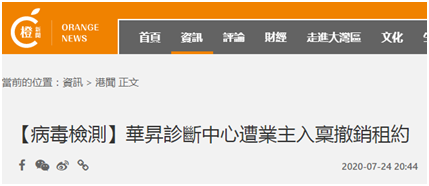 [环球网报道 记者 尹艳辉] 据香港电台网站、“橙新闻”等港媒7月24日报道,香港特区政府早前公布委聘两间内地私营公司为香港提供病毒检测,其中华升诊断中心位于大埔汀角路的诊所,日前被业主上诉到高等法院,要求法庭根据《失实陈述条例》下令撤销租约,并要交出单位。对此,有网友表示,“当然是又有小人在背后搞小动作啦!”“这些业主良心没了,为广大市民做检测原来是坏事!”