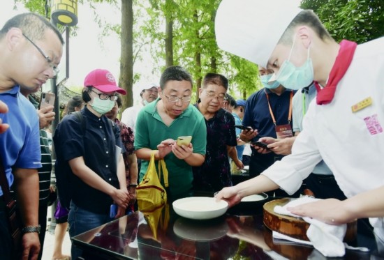 在趣园茶社,代表们纷纷拿出手机拍摄大厨们的现场表演,半块豆腐切8000多根细丝,一个小小的包子捏满32个褶,这些都让大家啧啧称奇。