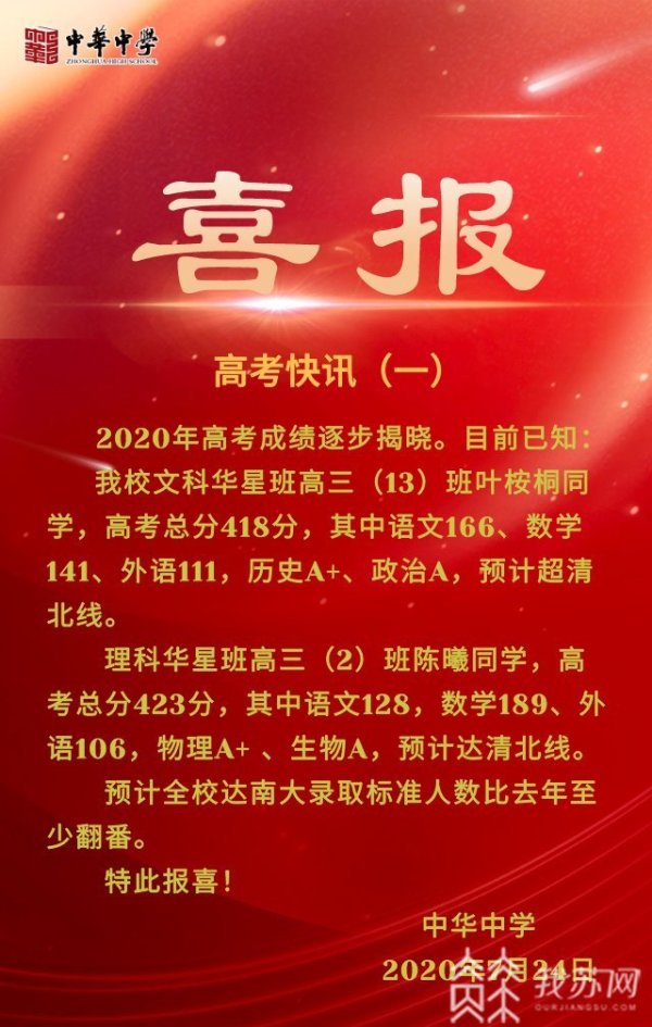 昨晚(7月24日)8点起,江苏高考成绩放榜,许多考生可能度过了一个不眠之夜,对南京各大高中来说,也检验一届“收成”之时。来看各校发出的喜报: