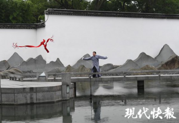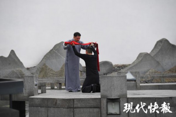 最终,学生手捧红色大带,柯军弯腰捧水,师徒二人隔着一汪池水,深深对拜。这一拜,是传统与先锋的碰撞,是江南和世界的相融。