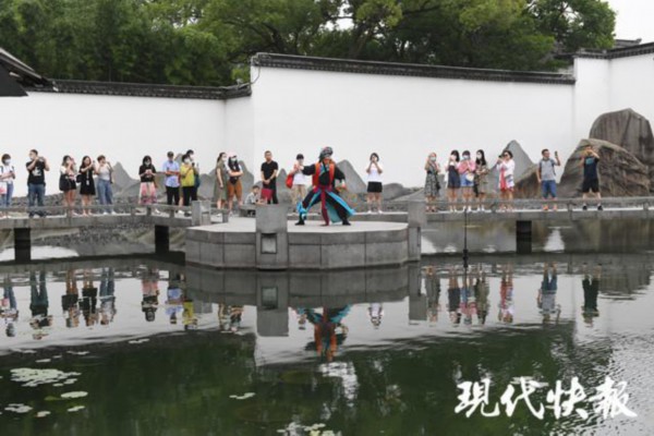 微风细雨、浸润江南,吹皱了一池春水,惊扰了成群的锦鲤,却劝不走围观的人群。三三两两的人撑开了手中的伞、成群结队的人躲在竹林叶下,还有更多的人干脆淋着雨,或站、或坐、或远近地浸润在这场难得一见的素昆演出中。