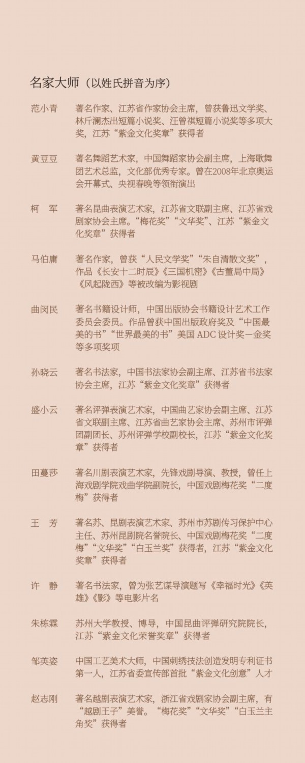 最传统最先锋,最江南最世界。苏州,历来都不只是温婉,还是时代的探路者和引领者;昆曲,素来都不只是才子佳人,还是历史的见证者和描摹者。正是因为这样的魅力,让 " 素昆盛典 " 迎来了 13 位文化艺术界的名家大师,这是一份光彩熠熠的名单(以姓氏拼音为序):