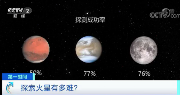 第一组数字,首先,50%。这是人类开始火星探测至今的60年里,火星探测大致的成功率。而人类对金星探测的成功率约77%,月球探测的成功率约76%。相比之下,50%就显得较低了,因此火星也被一些爱好者称为“探测器坟场”。