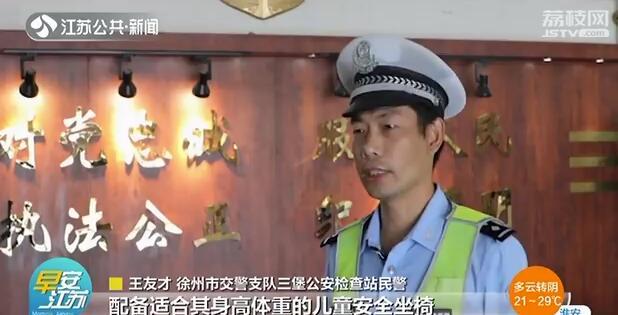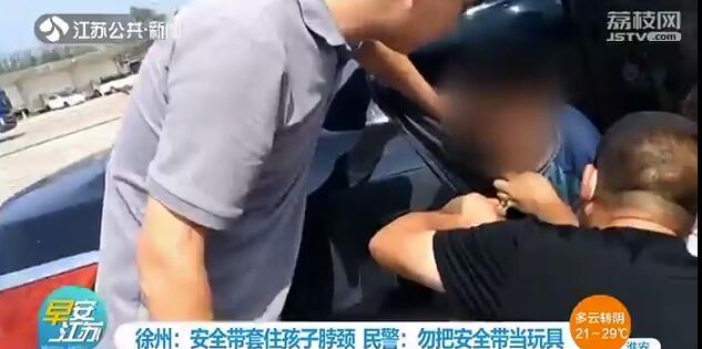 7月23日下午,在江苏徐州三堡公安检查站附近,一名男子向交警求助:自己的孩子被安全带卡住脖子,越缠越紧……