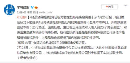 从7月25日起,港口客运站对不能提供7日内核酸检测阴性证明的离连旅客(包括本市户口、外市旅居或途径本市)实行劝返、退票处理。港口客运站继续对入港人员实行“亮码测温”,对进出港滚装车辆进行消毒处理。航行国际航线船舶船员换班除继续实行进境下船船员核酸检测外,上船船员也须提供7日内核酸检测阴性证明。