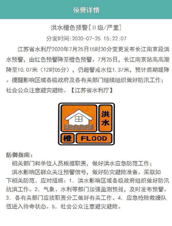 江苏省水利厅7月25日15时30分变更发布长江南京段洪水预警,由红色预警降至橙色预警。7月25日,长江南京站高高潮降至10.07米(12时05分),仍超警戒水位1.37米,预计后期缓降。提醒影响区域各级政府及各有关部门继续做好防汛工作,社会公众注意避灾避险。