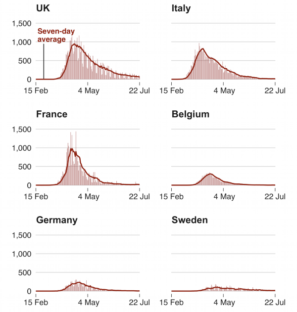 △欧洲部分国家新冠肺炎确诊病例统计图(图片来源:BBC)