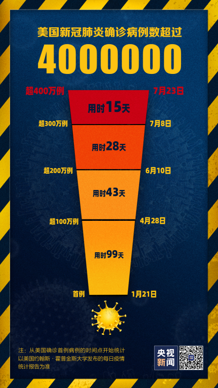 自1月21日,美国报告首例新冠肺炎确诊病例以来,美国确诊病例数的增长速度在不停加快:从第1例到第100万例,用了99天;从100万例到200万例,用了43天;从200万例到300万例,用了28天;而确诊病例从300万增至400万,仅用了15天。