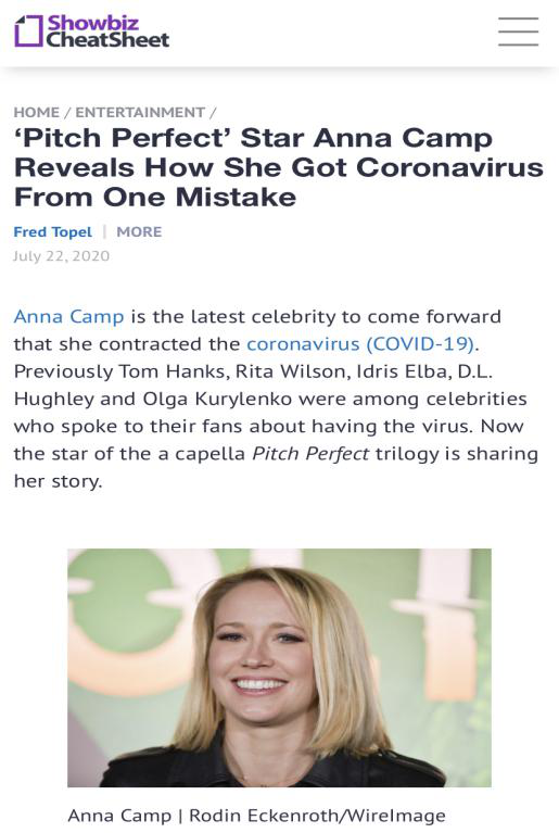7月21日,曾出演音乐喜剧电影《完美音调》的好莱坞明星安娜·坎普公开宣布感染新冠病毒。她表示,自己曾因侥幸心理在公共场所摘下口罩,并因此感染。对于治疗的过程,她说:“人们总说新冠病毒和普通感冒病毒一样,但其实并非如此。它会使人完全失去嗅觉和味觉,还会造成眩晕、疲乏、腹痛、呕吐和高烧等症状。”通过讲述个人经历,坎普呼吁民众不要对新冠病毒掉以轻心,务必坚持在公共场所佩戴口罩。
