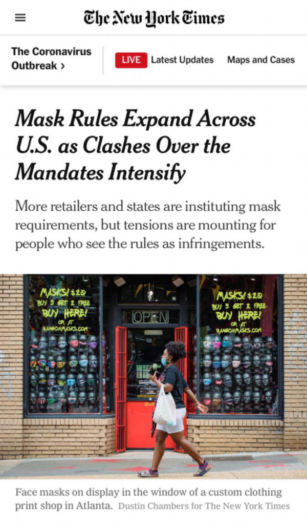 △《纽约时报》称,尽管对于口罩的接受度逐渐上升,但对于政府能否强制民众佩戴口罩仍有争议
