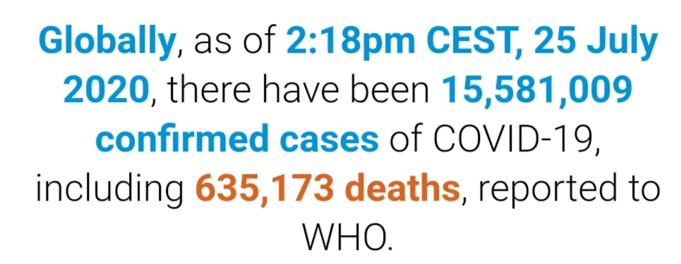 根据世卫组织最新实时统计数据,截至欧洲中部夏令时间7月25日14时18分(北京时间7月25日20时18分),全球累计新冠肺炎确诊病例15581009例,累计死亡病例635173例。