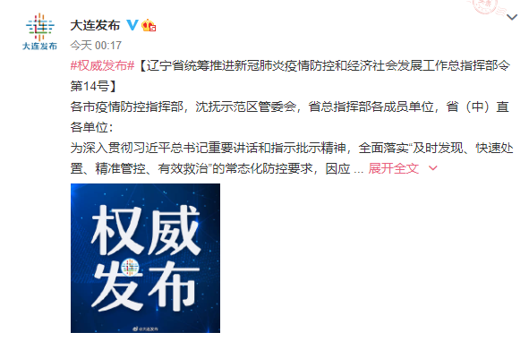荔枝新闻讯 7月25日,辽宁省统筹推进新冠肺炎疫情防控和经济社会发展工作总指挥部发布总指挥部令: