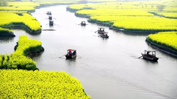 “河有万湾多碧水,田无一垛不黄花。”三、四月间的兴化,最美的一道风景就是这片碧水之上的千垛花田。