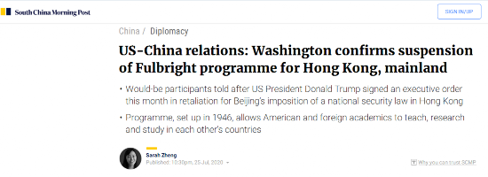 7月14日,特朗普签署行政命令,结束香港享有的优惠待遇,该行政令中还有一项条款称,美国将中止与中国内地和香港的富布赖特交流项目。香港《南华早报》25日晚报道称,美国方面已证实,已暂停与中国内地和香港开展这一国际交流项目。报道提到,一份由富布赖特项目成员和校友组织的请愿书上已有逾1500人签名反对美国这一决定。富布赖特项目是美国于1946年建立的国际交流项目,而中国是首个参与该项目的国家。