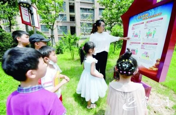7月25日上午,宿城区幸福街道幸福社区隆城丹郡小区的民法典主题广场上迎来了一群小学生,他们是参加幸福社区“七彩暑假法律行”未成年人普法活动的孩子。“从建筑物中抛掷物品或者从建筑物上坠落的物品造成他人损害的……”小学生刘沐熙认真读着展示板上的民法典条例。