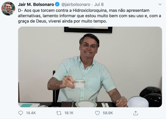 在被迫隔离的几周内,博索纳罗多次在社交媒体上为羟氯喹“打广告”。据法新社报道,博索纳罗称“我相信羟氯喹,你呢?”呼吁大家服用羟氯喹治疗新冠。22日,他还在脸书上称羟氯喹是有效的,他的政治对手出于政治目的在反对使用羟氯喹。在宣布检测结果呈阴性时,博索纳罗也再次为羟氯喹“点赞”。