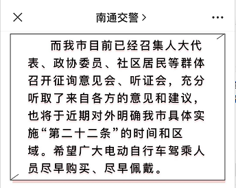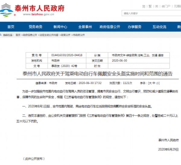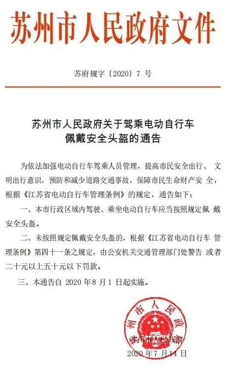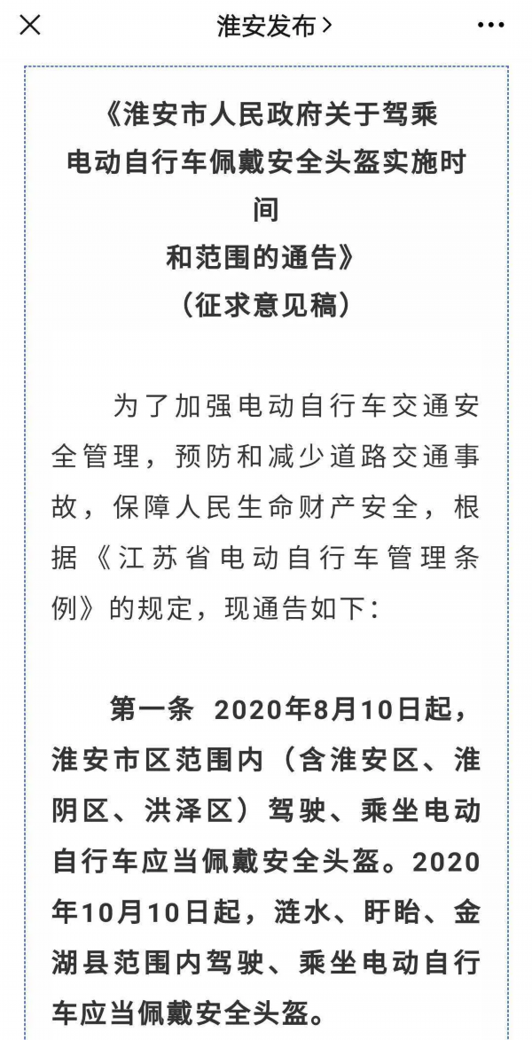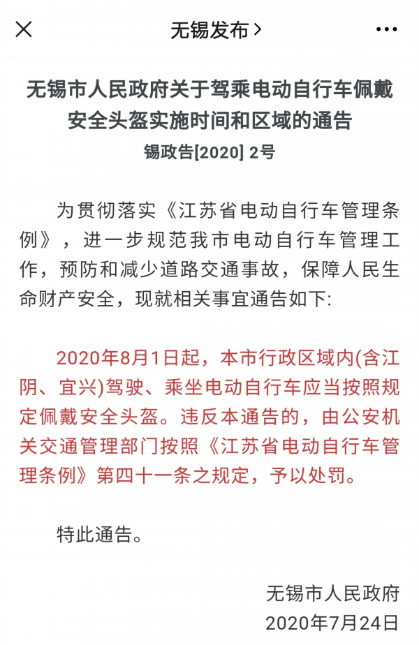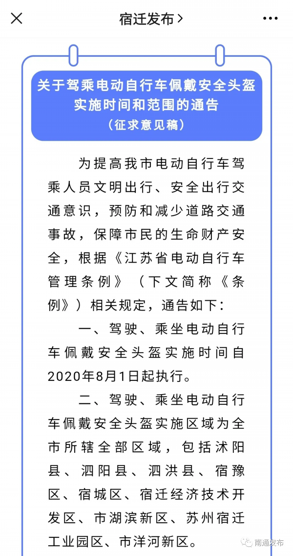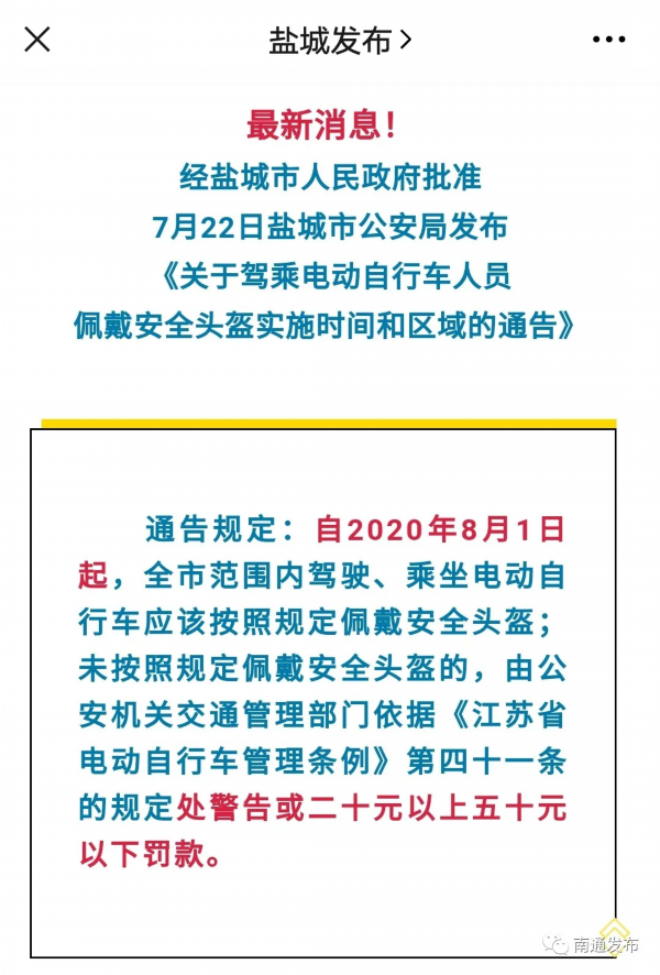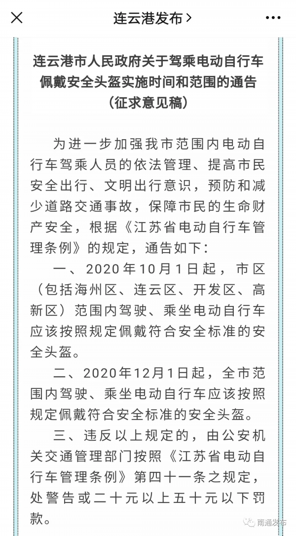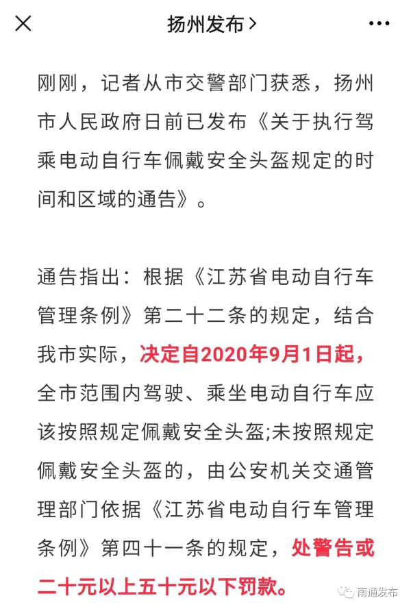 截至目前,江苏省多地都已发布通告明确了“骑乘不戴安全头盔”处罚的时间和范围。