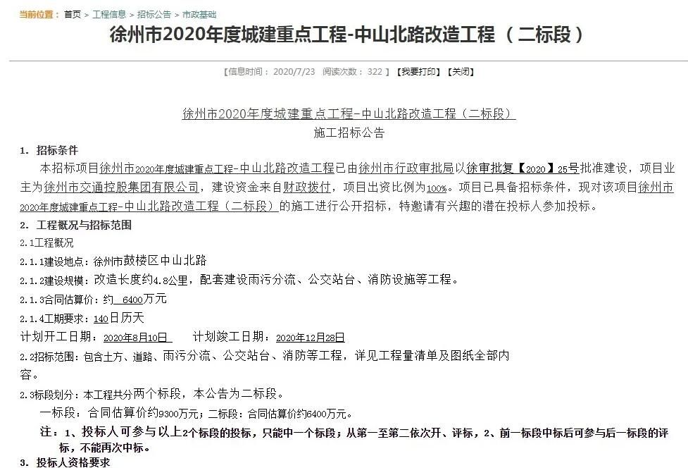 7月23日,徐州市公共资源建设工程交易平台发布了徐州市2020年度城建重点工程-中山北路改造工程一标段和二标段的招标公示。