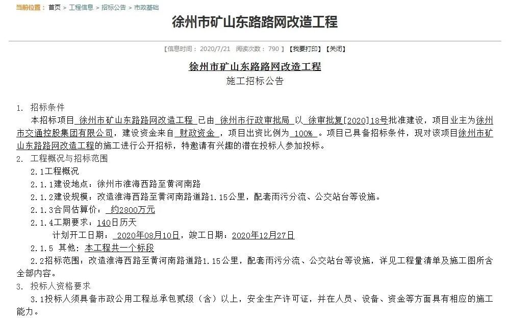 7月21日,徐州市公共资源建设工程交易平台发布了徐州市矿山东路路网改造工程招标公告。