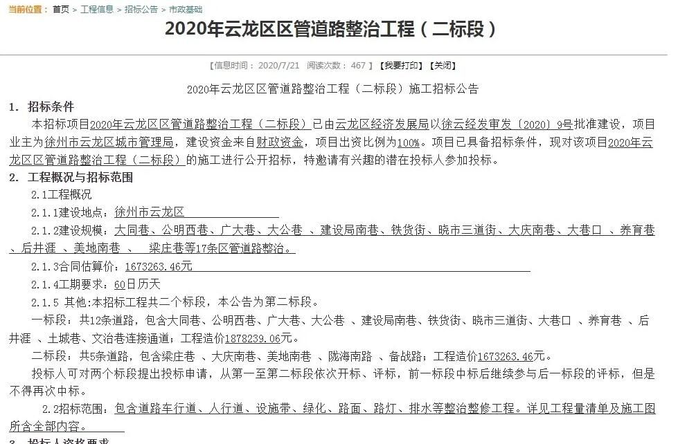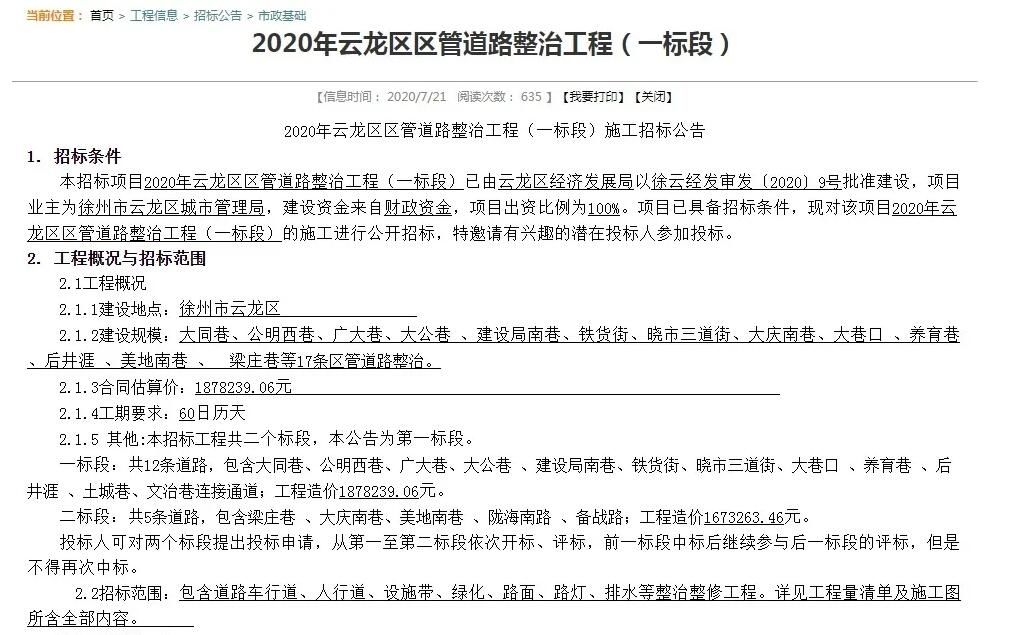 7月21日,徐州市公共资源建设工程交易平台发布了2020年云龙区区管道路整治工程一标段和二标段的招标公告。