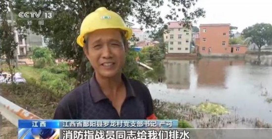 江西省鄱阳县罗龙村党支部书记 严可 :稻田受灾1000多亩,消防指战员同志们帮我们排水,现在水位下去了。