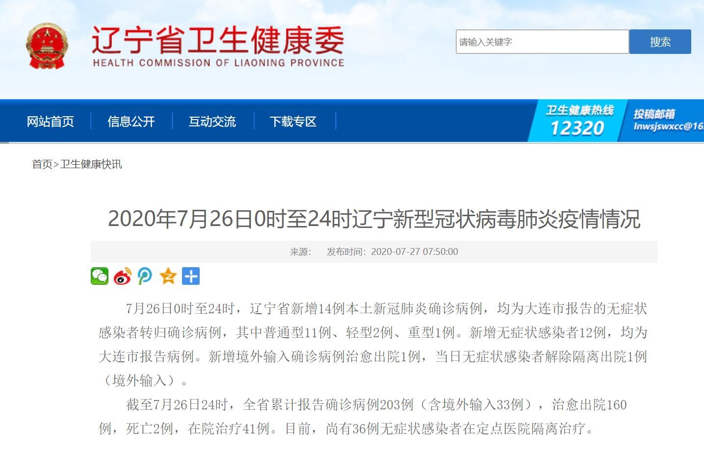 荔枝新闻讯 据辽宁卫健委官网消息,7月26日0时至24时,辽宁省新增14例本土新冠肺炎确诊病例,均为大连市报告的无症状感染者转归确诊病例,其中普通型11例、轻型2例、重型1例。新增无症状感染者12例,均为大连市报告病例。新增境外输入确诊病例治愈出院1例,当日无症状感染者解除隔离出院1例(境外输入)。
