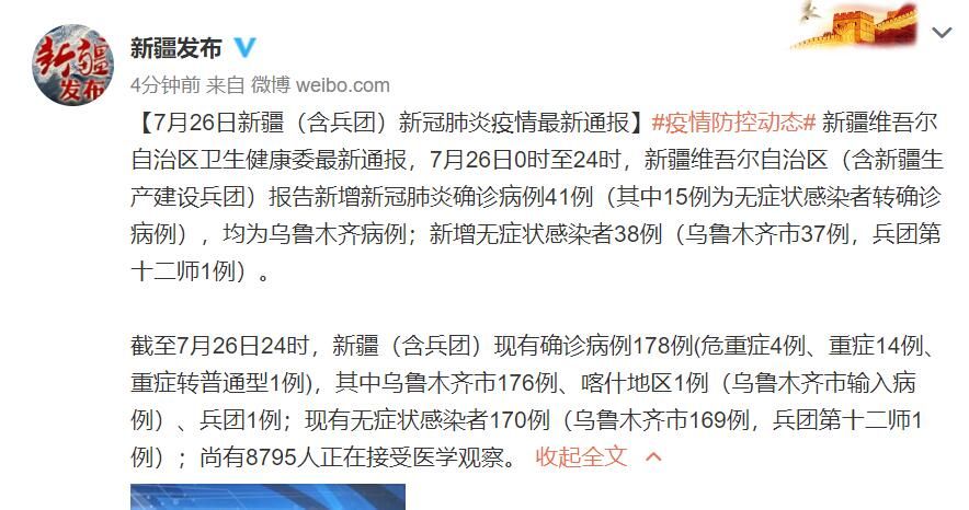 截至7月26日24时,新疆(含兵团)现有确诊病例178例(危重症4例、重症14例、重症转普通型1例),其中乌鲁木齐市176例、喀什地区1例(乌鲁木齐市输入病例)、兵团1例;现有无症状感染者170例(乌鲁木齐市169例,兵团第十二师1例);尚有8795人正在接受医学观察。