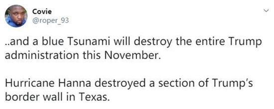 有网友评论称,“飓风汉娜刮倒了得克萨斯的一段特朗普的边境墙。等到11月,蓝色的海啸将摧毁整个特朗普政府。”↓