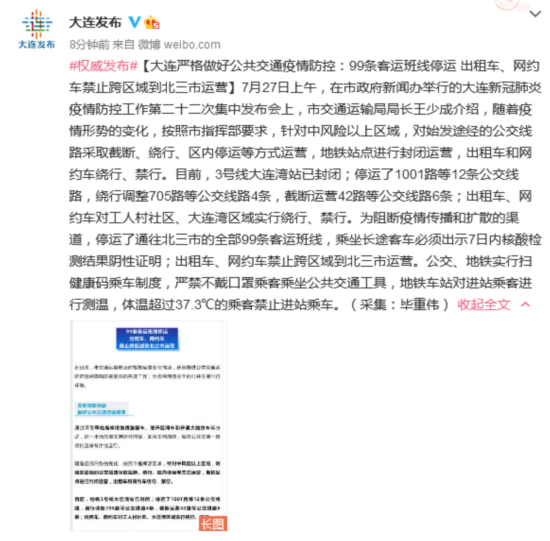 荔枝新闻讯 据@大连发布微博消息,7月27日上午,在大连市政府新闻办举行的大连新冠肺炎疫情防控工作第二十二次集中发布会上,市交通运输局局长王少成介绍,随着疫情形势的变化,按照市指挥部要求,针对中风险以上区域,对始发途经的公交线路采取截断、绕行、区内停运等方式运营,地铁站点进行封闭运营,出租车和网约车绕行、禁行。