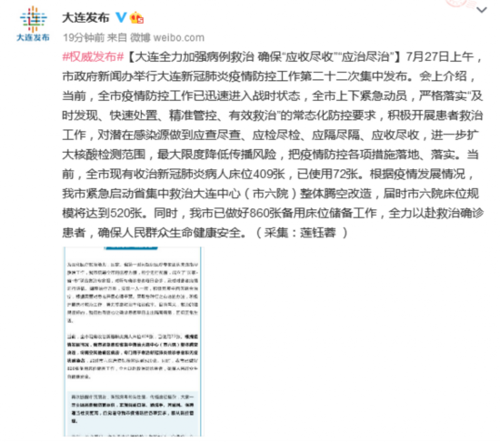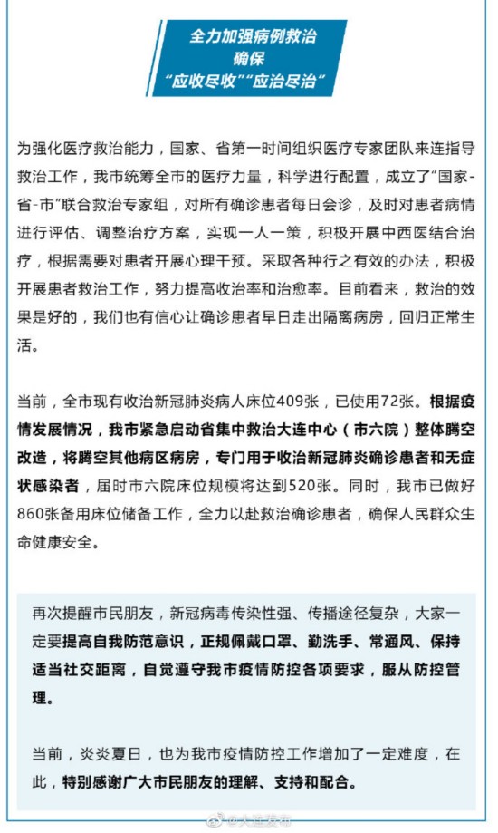 荔枝新闻讯 据@大连发布微博消息,7月27日上午,大连市政府新闻办举行大连新冠肺炎疫情防控工作第二十二次集中发布。会上介绍,当前,全市疫情防控工作已迅速进入战时状态,全市上下紧急动员,严格落实“及时发现、快速处置、精准管控、有效救治”的常态化防控要求,积极开展患者救治工作,对潜在感染源做到应查尽查、应检尽检、应隔尽隔、应收尽收,进一步扩大核酸检测范围,最大限度降低传播风险,把疫情防控各项措施落地、落实。