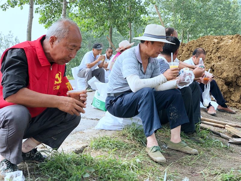 上午9点40,河堤上微风习习,气温还算舒适。后背被汗水打湿的张培全和大伙儿停下来休息。有的抽支烟解解乏,有的喝口水解解渴。