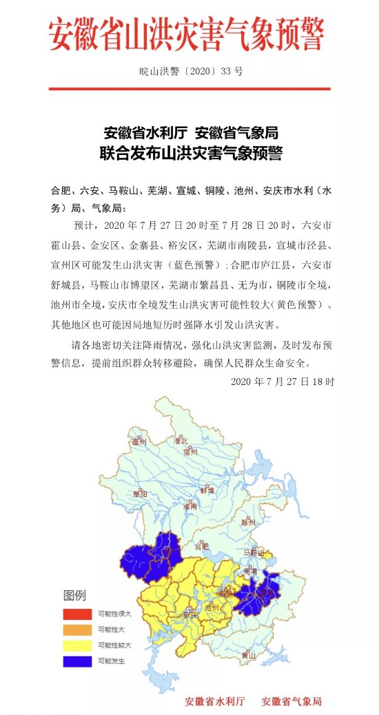 山洪灾害气象预警显示,从7月27日20点至7月28日20点,合肥市庐江县,六安市舒城县,马鞍山市博望区,芜湖市繁昌县、无为市,铜陵市全境,池州市全境,安庆市全境发生山洪灾害可能性较大,为黄色预警区;六安市霍山县、金安区、金寨县、裕安区,芜湖市南陵县,宣城市泾县、宣州区可能发生山洪灾害,为蓝色预警区;其他地区也可能因局地短历时强降水引发山洪灾害。提醒各地密切关注降雨情况,强化山洪灾害监测,及时发布预警信息,提前组织群众转移避险,确保人民群众生命安全。