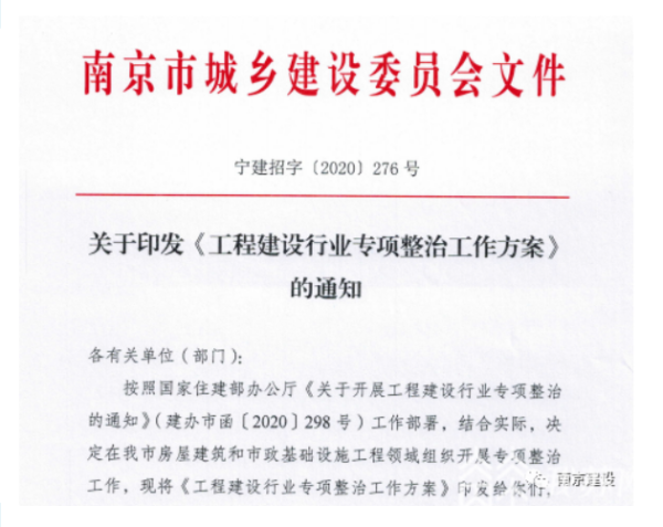 南京市建委成立工程建设行业专项整治工作专班,由招投标分管领导担任组长,按照“谁监管谁负责”的原则,推进本部门工程建设行业专项整治工作。