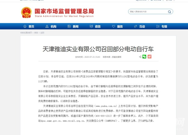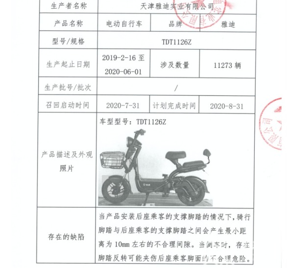 国家市场监管总局官网近日发布召回公告,称天津雅迪实业有限公司按照《消费品召回管理暂行规定》的要求,向国家市场监督管理总局报告了召回计划,将召回2019年2月至2020年6月期间制造的雅迪牌TDT1126Z型电动自行车,涉及数量为11273辆。