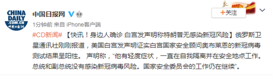 俄罗斯卫星通讯社刚刚报道,美国白宫发声明证实白宫国家安全顾问奥布莱恩的新冠病毒测试结果呈阳性。 声明称,“他有轻度症状,一直在自我隔离并在安全地点工作。总统和副总统没有感染新冠病毒风险。国家安全委员会的工作仍在继续”。