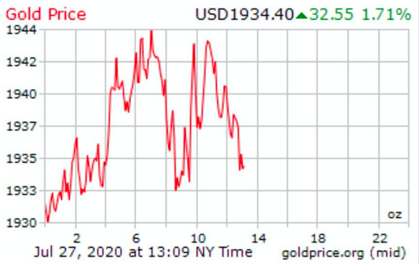 央视新闻消息,本周一(27日),在投资者压力下,黄金价格上涨幅度超过2%,达到创纪录的每盎司1945.16美元。突破了2011年9月创下的近十年历史最高点1921美元。详情》