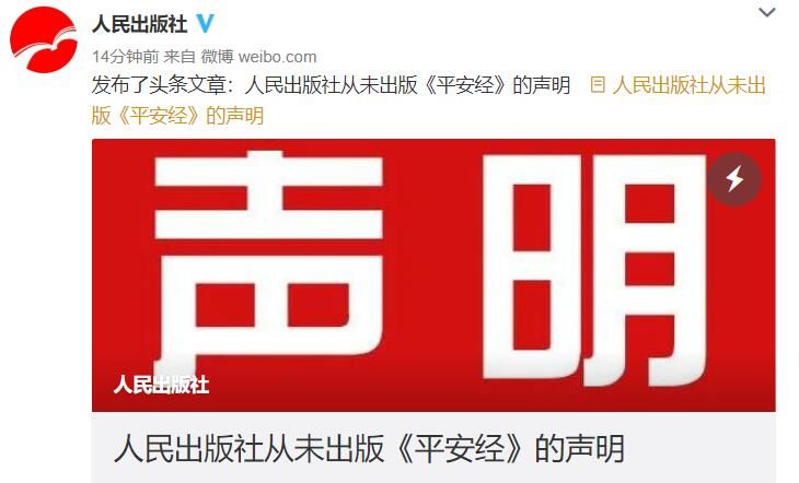 最新消息:据人民出版社官方微博7月28日消息,表示从未出版《平安经》一书,也从未同意与任何单位联合出版该书。对于假冒名义出版该书的行为及其相关责任人,将保留追究其相关法律责任的权利。