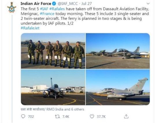 印度空军在其官方社交媒体帐号贴出5架“阵风”战机从法国飞往印度的照片,其中还有“阵风”战机空中加油的照片。