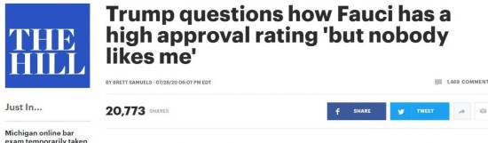 《国会山报》:特朗普提问称,为什么福奇有很高的支持率,但没有人喜欢我?