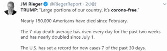 “自2月份以来,已有近15万美国人死亡。过去两周,7天平均死亡人数每日都在上升,自7月1日以来几乎翻了一番。在过去的30天里,美国7个地区已经刷新了新增病例的记录。”