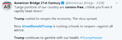 “特朗普急于重启经济。但病毒还在传播。现在,他不顾所有建议,匆忙催促学校重新开学。特朗普继续不惜以我们的健康为赌注。”