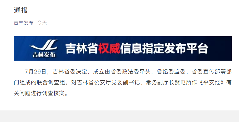 荔枝新闻讯 据吉林发布微信公众号消息,7月29日,吉林省委决定,成立由省委政法委牵头,省纪委监委、省委宣传部等部门组成的联合调查组,对吉林省公安厅党委副书记、常务副厅长贺电所作《平安经》有关问题进行调查核实。